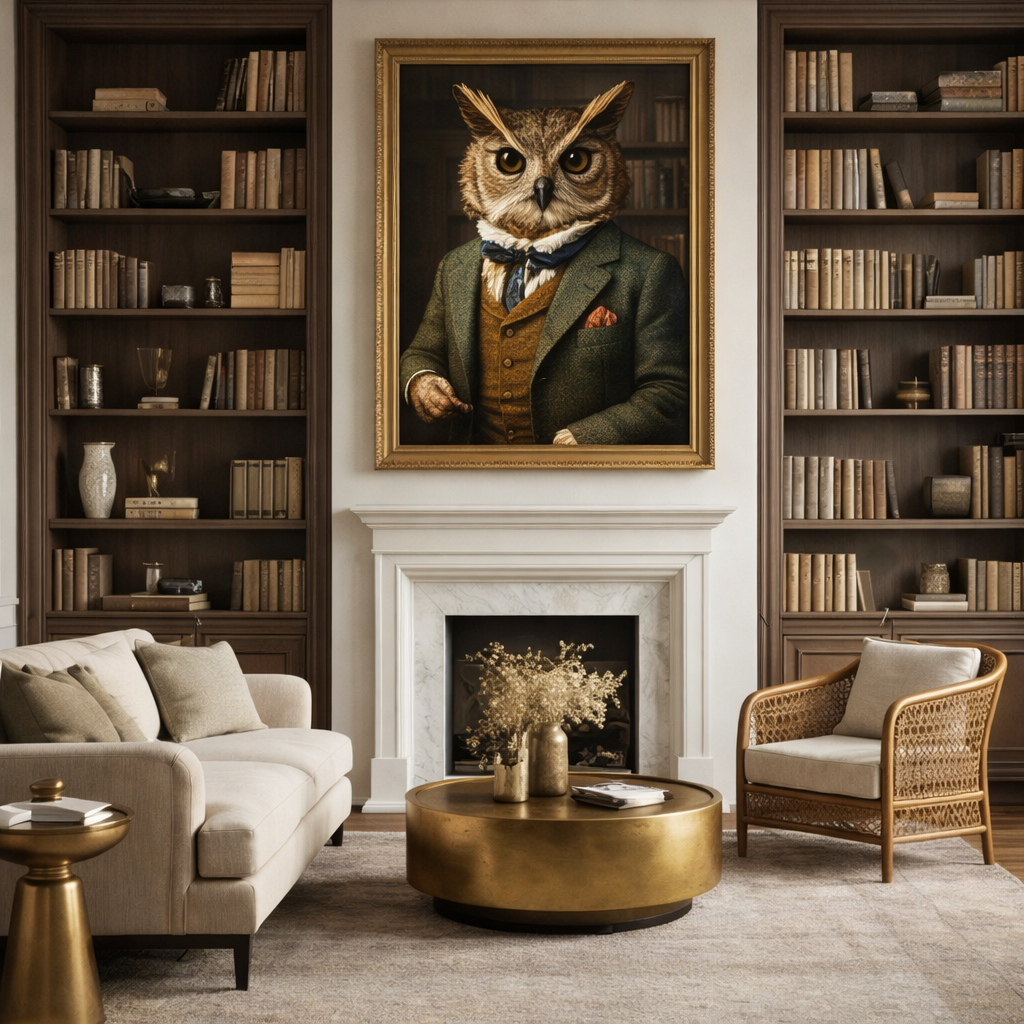 Animalcore blends classic portrait tradition with natural, moody interiors — deep greens, warm metals, and subtle surreal detail. The goal is a premium focal point that feels at home in a grown-up space.